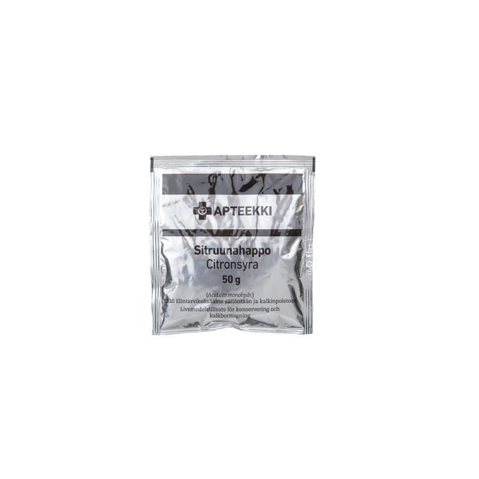 Sitruunahappo säilöntään ja kalkinpoistoon. Valmistettu Suomessa.