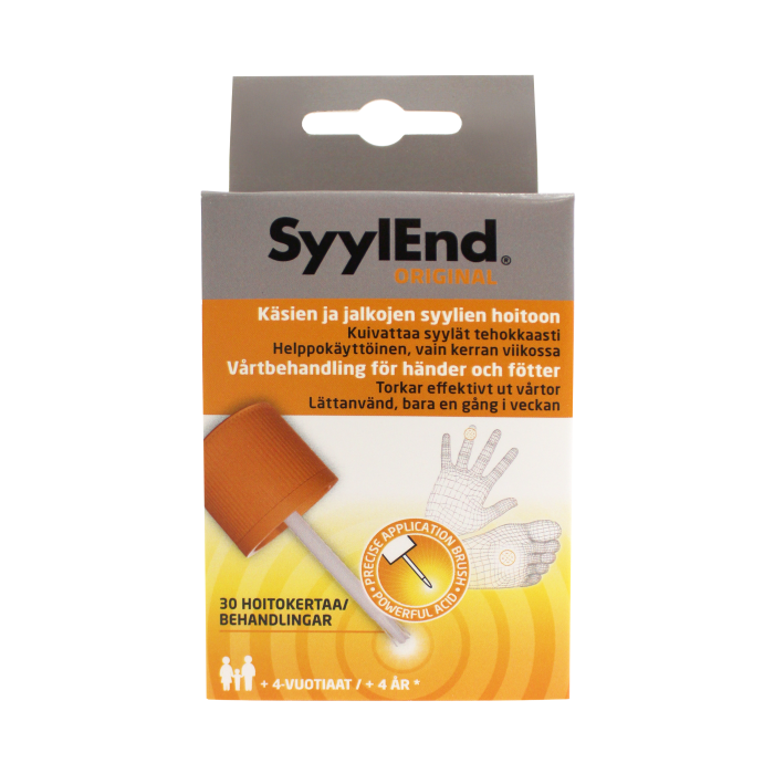 SyylEnd ORIGINAL-lösning är ett effektivt egenvårdsmedel för att ta bort vårtor på händer, fötter, armbågar och knän. Den torkar ut vårtan inifrån och avlägsnar den helt. Den aktiva ingrediensen är myrsyra.
